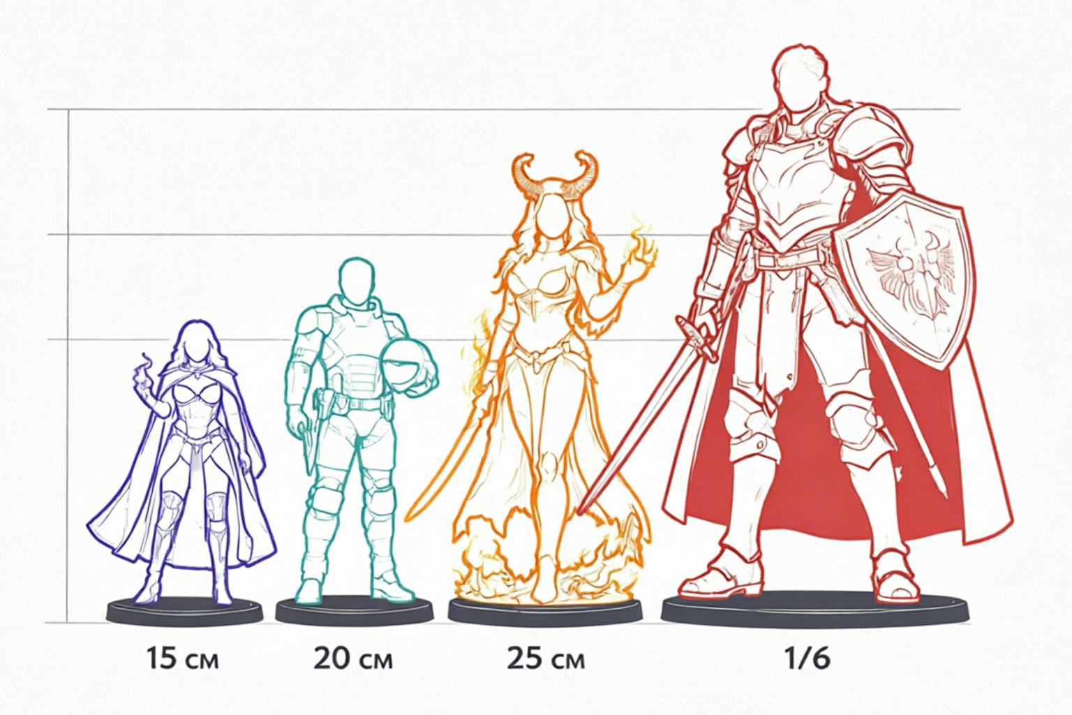 В: Какие размеры у ваших фигурок? О: Размеры наших фигурок пропорциональны. Ширина и длина зависят от высоты и расширяются пропорционально ей для сохранения гармоничных пропорций персонажа. Основной параметр, который мы указываем — это высота фигурки (например, 25 см). В: Как определяется размер Премиум фигурки 1/6? О: Масштаб 1/6 означает, что фигурка уменьшена в 6 раз по сравнению с реальным ростом персонажа. Пример: Если персонаж ростом 180 см, фигурка будет примерно 30 см в высоту. С учётом подставки фигурка будет выше 30 см. В: Мне нужен нестандартный размер (больше или меньше). Это возможно? О: Да, это возможно! Наше производство адаптивно. Если вам нужен другой размер, просто напишите нам в чат поддержки, в соцсети или на почту после выбора модели. Мы рассчитаем стоимость и сроки изготовления фигурки в нужном вам масштабе. В: Как узнать точные габариты конкретной фигурки? О: На странице товара всегда указана высота. Ориентировочные пропорции можно оценить по фотографиям. Если вам критически важны точные ширина и глубина для полки или витрины — напишите нам, и мы оперативно предоставим все размеры для выбранной модели.